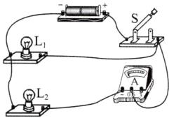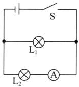 (2)若要 L₁ 与 L₂ 组成并联电路,且要求开关 S 同时控制 L₁ 与 L₂,电流表测量 L₂ 所在支路的电流,请在图乙中补充两根导线以完成电路连接;