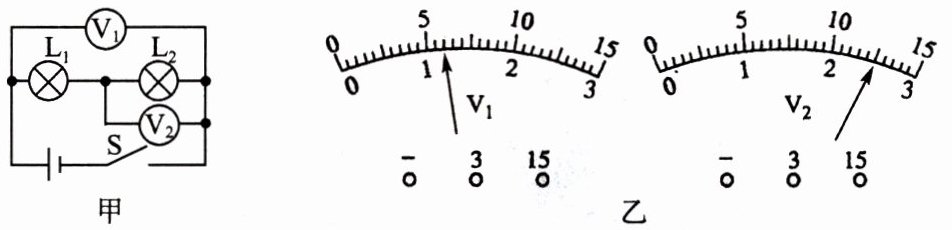 1.下图甲所示的电压表所用测量范围不明,闭合开关 S 后,电压表 V₁ 和 V₂ 的示数分别如图乙所示,则电压表 V₁ 所用的测量范围为