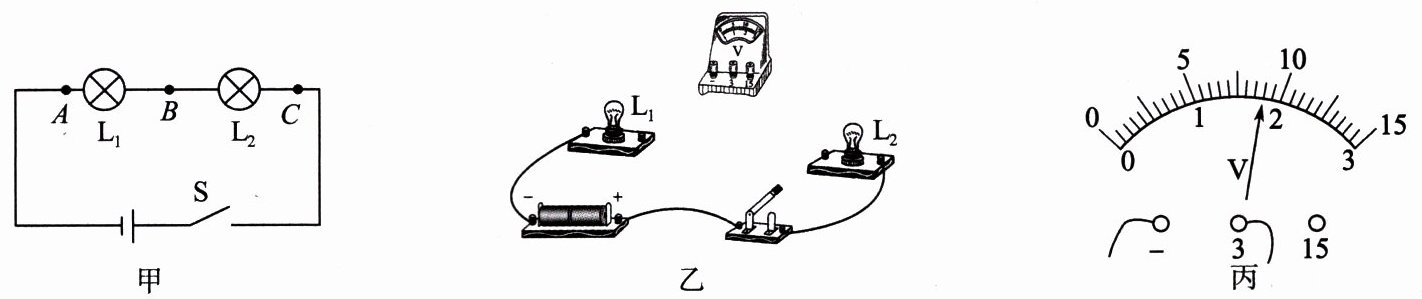 (4) 正确连接电路后,闭合开关 S,电压表的示数如图丙所示,此时小灯泡 L₁两端的电压为V。一段时间后,L₁突然熄灭,L₂仍然发光,电压表无示数,原因可能是。