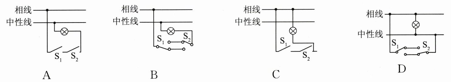 10. 教学楼每层走廊的中间装有一盏路灯,在两头楼梯处各有一个开关控制该灯。为了从这一头开(或关)灯而到另一头能够关(或开)灯,下图中设计最合理的是(
