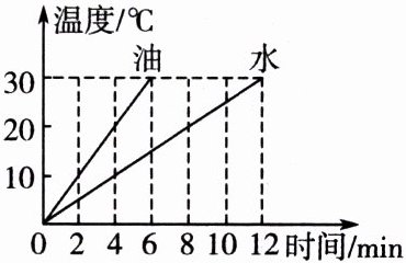 11.在完全隔热的装置内,用同一热源给100g水和100g油加热,其温度随时间变化的关系如下图所示。已知水的比热容为$4.2×10^3J/(kg·℃)$,请通过计算回答下列问题: