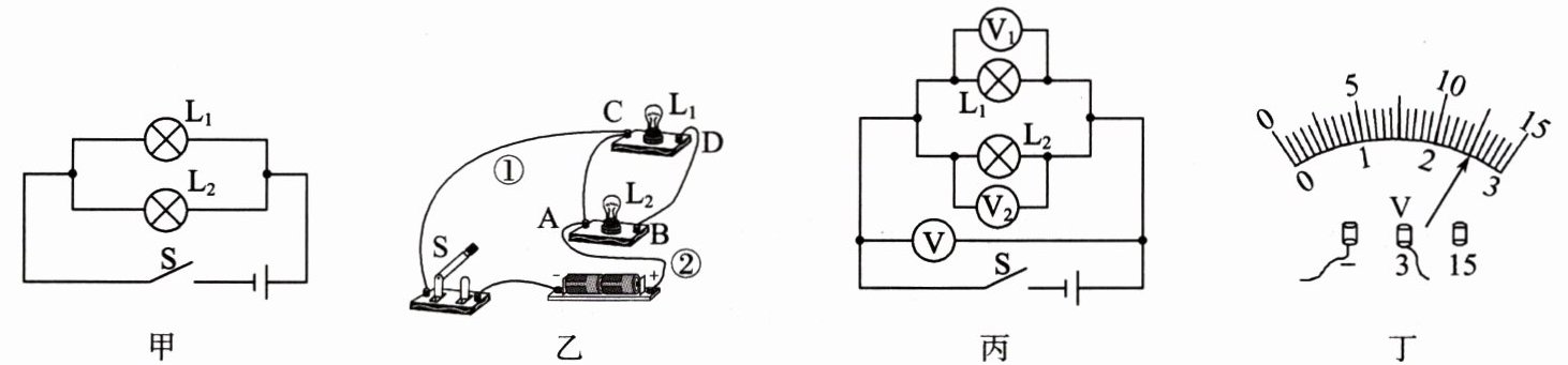 。(写出一种即可)(3) 接下来,他们按图丙所示电路图连接了三个电压表。实验过程中电压表 V₁的示数如图丁所示,则电压表 V₁的示数是