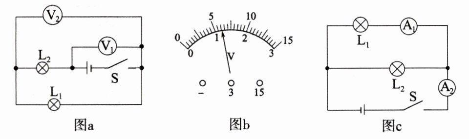 7. 下图 a 所示的电路中,$V_1$、$V_2$是两个相同的电压表。闭合开关后,灯泡 L₁和灯泡 L₂都发光,这时两个电压表的指针偏转角度相同,均为图 b 所示,指针刚好对准刻度线位置。