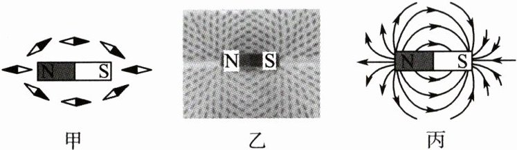 2. 某同学研究磁体周围的磁场情况,将一根条形磁体放在水平桌面上,在它周围放置一些小磁针,小磁针的指向情况如下图甲所示;将小磁针拿掉之后,在条形磁体上面放一块有机玻璃,玻璃上均匀撒一层铁屑,轻轻敲打玻璃,可以看到铁屑的分布情况如图乙所示;根据图甲和图乙所示的实验现象,用磁感线描述条形磁体周围的磁场情况如图丙所示。下列说法不正确的是(