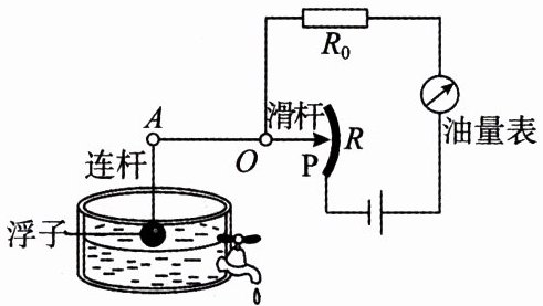 2.(2023·湖北十堰中考)右图是测量油箱内油量的装置,其中R是滑动变阻器的电阻片,AP是轻质滑杆,且$ AO > OP $,P是滑杆上可沿电阻片滑动的滑片,$ R_0 $是定值电阻。油量减少时,浮子通过连杆带动滑杆绕O点转动,使滑片P在R上滑动。