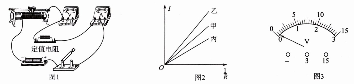 (选填“短路”或“断路”)故障,故障排除后,移动滑片,使电压表示数为2V,记录电流表示数,多次更换定值电阻重复实验,得到电流I与定值电阻R的倒数的关系如图2中图线甲所示,从而得出结论。(4)实验结束后,小明应先断开开关,再拆除
