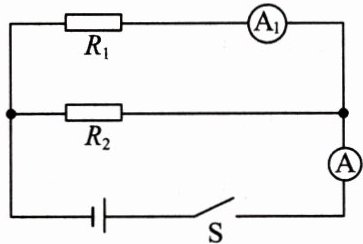 1. 如右图所示,电源电压保持不变,电阻 $ R_{1} = 15 \Omega $,闭合开关 $ \mathrm{S} $,电流表 $ \mathrm{A}_{1} $ 的示数为 $ 0.8 \mathrm{A} $,电流表 $ \mathrm{A} $ 的示数为 $ 1.2 \mathrm{A} $,则电阻 $ R_{2} = $