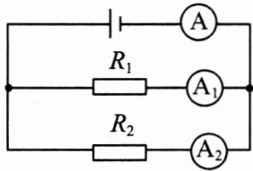 1. 下图所示的电路中,电源电压为 $ 6 \mathrm{V} $,电阻 $ R_{1} $ 为 $ 3 \Omega $,电阻 $ R_{2} $ 为 $ 6 \Omega $。计算图中三只电流表的示数。