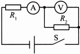 3.(2023·四川甘孜州中考)如右图所示,$ R_{1} = 10 \Omega $,开关闭合后电流表的示数是 $ 0.2 \mathrm{A} $,电压表的示数是 $ 4 \mathrm{V} $,$ R_{2} $ 的电阻为