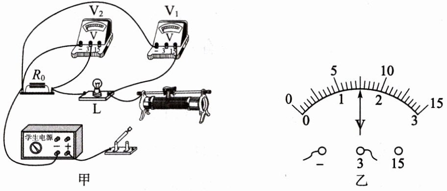 (3)由图乙可知,电压表接的是0~3V的测量范围,分度值为0.1V,指针所指位置的示数为1.5V,所以电压表$V_2$的示数为1.5V;由欧姆定律可知,此时通过小灯泡的电流为$I = \frac{U_0}{R_0} = \frac{1.5V}{10 \Omega} = 0.15A$