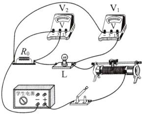 (2)由实物图可知,定值电阻$R_0$、灯泡、滑动变阻器三者串联,电压表$V_1$测$R_0$与灯泡两端的电压,电压表$V_2$测$R_0$两端的电压,闭合开关移动滑片,发现小灯泡不发光,电压表$V_1$的示数接近电源电压,电压表$V_2$无示数,说明电路出现了断路故障,若$R_0$断路,则电压表$V_1$与电压表$V_2$示数都接近电源电压,不符合题意;若灯泡断路,则电压表$V_1$串联在电路中测电源电压,电压表$V_2$所在部分断路,电压为0,满足题意;若滑动变阻器断路,则电压表$V_1$与电压表$V_2$示数都为0,不满足题意。综上所述,电路故障是灯泡断路。