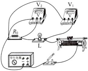 (4)由实物图可知,电压表$V_1$测$R_0$与灯泡两端的电压,当电压表$V_1$的示数为5V时,小灯泡正常发光,依题意可知,小灯泡正常发光时额定电压为2.5V,则$R_0$两端的电压为$U_0' = U - U_L = 5V - 2.5V = 2.5V$