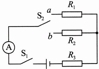 1.右图所示的电路中,电源电压恒定,定值电阻$R_{1}=6\Omega$,$R_{3}=6\Omega$,$R_{2}=12\Omega$。闭合开关$S_{1}$,单刀双掷开关$S_{2}$接$a$时,电流表的示数为$0.6A$;闭合开关$S_{1}$,单刀双掷开关$S_{2}$接$b$时,电流表的示数为