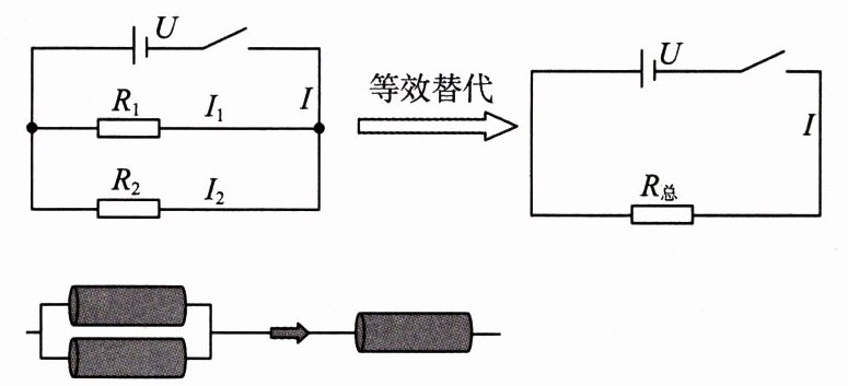 ,又由于$U = IR_{总}$,所以$\frac{1}{R_{总}}=$$\frac{1}{R_1} + \frac{1}{R_2}$