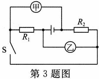 3.(2023·黑龙江齐齐哈尔中考)如上图所示,已知$R_{1}:R_{2}=2:1$,当开关$S$闭合,甲、乙两电表均为电压表时,两电表示数之比为$U_{甲}:U_{乙}=$