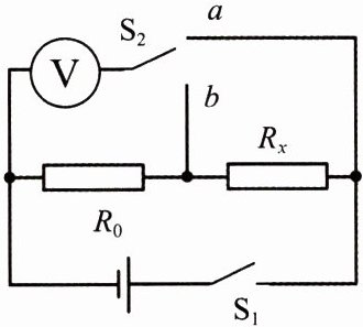 1. (2023·安徽中考) 右图所示的电路中,电阻 $ R_0 = 12 \, \Omega $。闭合开关 $ S_1 $,将单刀双掷开关 $ S_2 $ 掷于 $ a $ 端,电压表示数为 $ 2.5 \, V $;将 $ S_2 $ 切换到 $ b $ 端,电压表示数为 $ 1.5 \, V $,则电阻 $ R_x $ 的阻值为