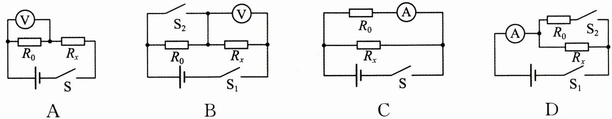 (2) 如果实验中只有一只电压表或只有一只电流表,其他器材不变,则下列四种电路设计中,能测出 $ R_x $ 的是