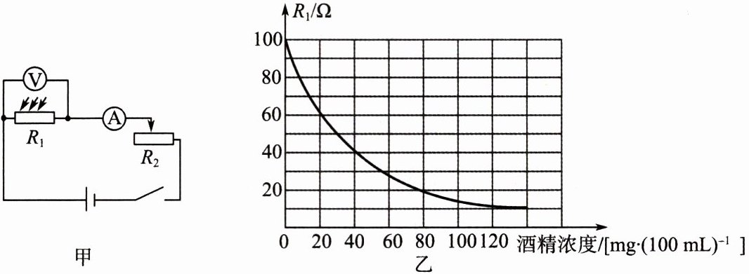 (1)由题图甲可知,两电阻串联,电压表测$R_1$两端的电压,电流表测电路中的电流,由图乙可知,当气体中的酒精浓度为0时,$R_1 = 100\ \Omega$,此时电路中的电流