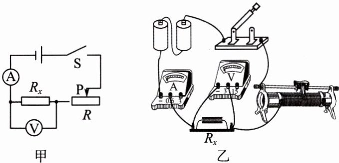 4. (2024·重庆九龙坡区月考) 小华做“测量定值电阻 $ R_x $ 的阻值”实验,现有器材:待测电阻 $ R_x $,两节新干电池,电压表,电流表,滑动变阻器,开关,导线若干。图甲就是所用电路图,图乙是其对应的实物图。请回答下面的问题。