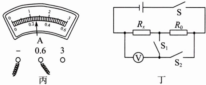 (5) 该小组在进行“伏安法”测定值电阻阻值的实验中,发现电流表已损坏,只需添加两个开关,并用一个已知阻值为 $ R_0 $ 的定值电阻替换滑动变阻器,设计了如图丁所示的实验电路。电源电压未知但不变,请完成实验步骤: