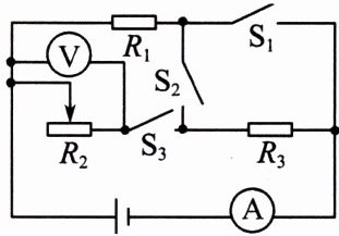 闭合开关$S_{3}$,断开开关$S_{1}$、$S_{2}$时,$R_{2}$与$R_{3}$串联,电压表测$R_{2}$两端的电压。