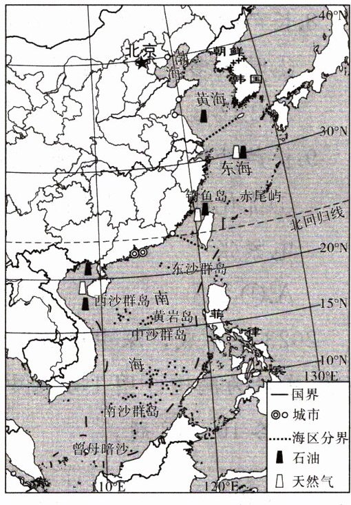 )① 岛礁旅游资源 ② 热带草原资源 ③ 海洋石油资源 ④ 海洋天然气资源