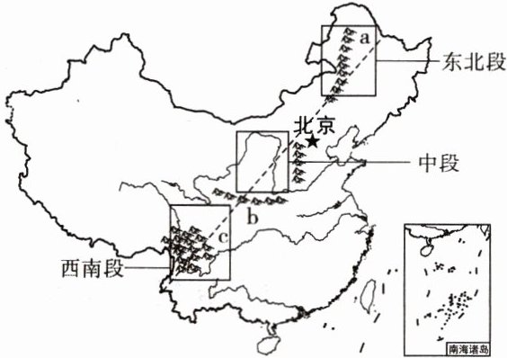(2024·四川中考)某旅游团将组织游客“走胡线”(“胡线”即“胡焕庸线”)漫步中国,该旅游路线分成东北段、中段、西南段。读“走胡线”路线图,回答 6~7 题。