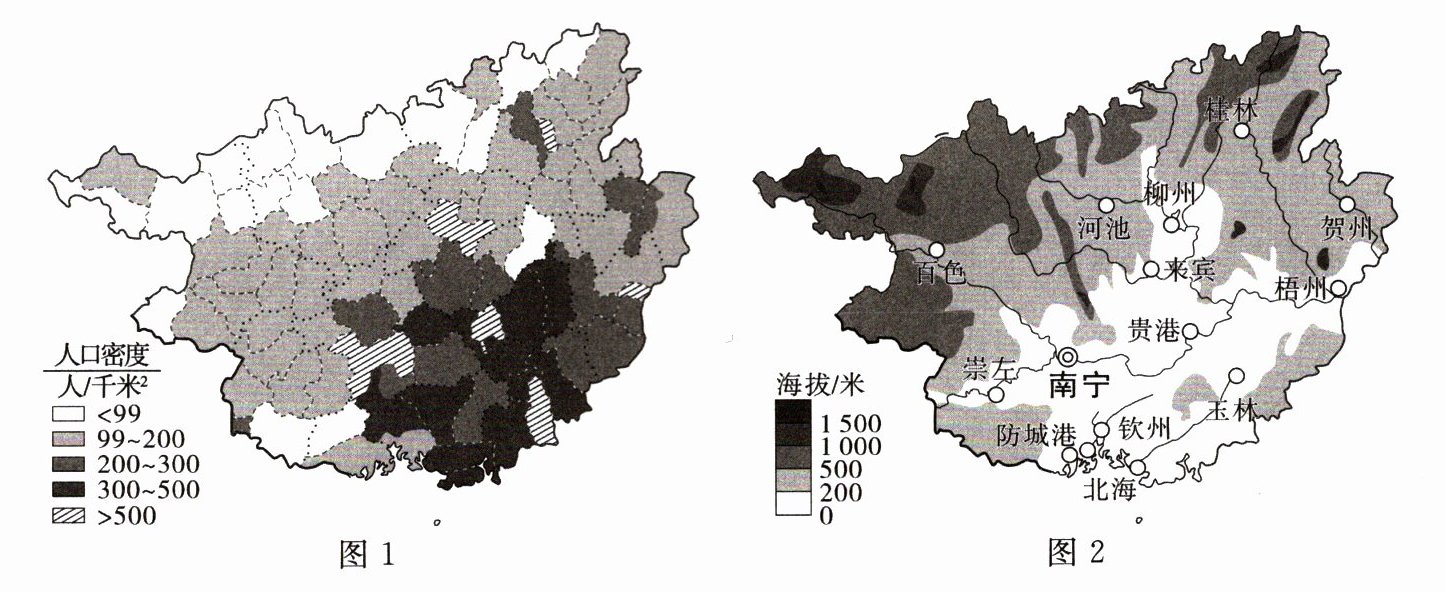 材料一 人口的分布状况深受地理环境的影响。图 1 为广西壮族自治区各县区人口密度分布示意图,图 2 为广西壮族自治区地形和主要河流分布示意图。据此开展探究。