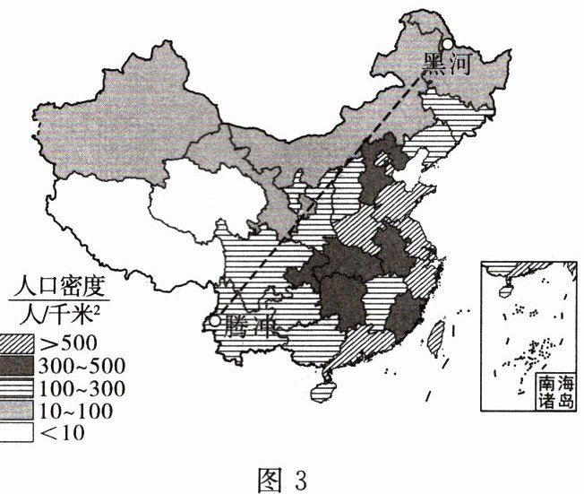 材料二 20 世纪 30 年代,地理学家胡焕庸绘制了中国人口密度图,提出了黑河—腾冲人口地理界线,该线被称为“胡焕庸线”。这条分界线揭示了中国人口分布的基本格局。图 3 为胡焕庸线示意图。