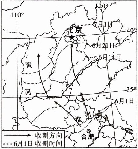 (2024·安徽中考)春末夏初,我国某粮食主产区的作物自南向北渐次变成金黄色。驾驶收割机的农机手们从安徽省中部出发,带着乡村收获的喜悦,一路向北,描绘祖国丰收的画卷。右图示意该主产区粮食作物收割状况。据此回答 5~6 题。