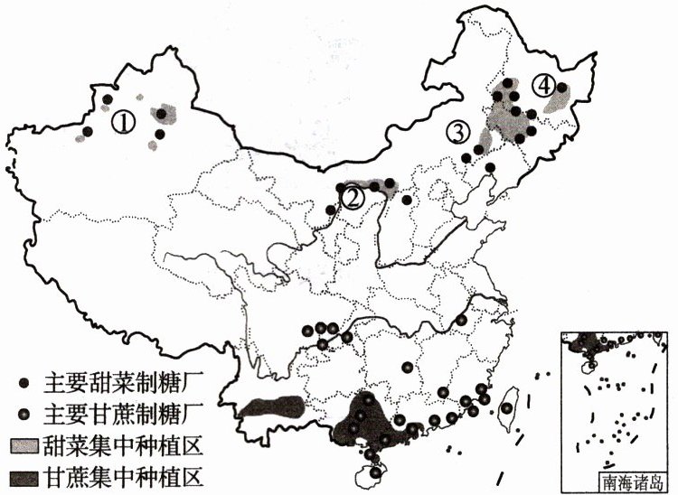 (2023·德州中考)下图为我国制糖工业分布区图。读图,回答 7~8 题。