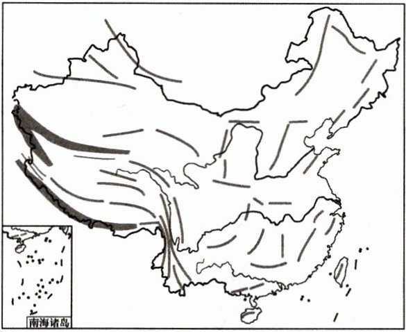 找出以下山脉,并观察走向,依次将字母或序号填注在下面空白图中的对应位置,以利于相互对照记忆。