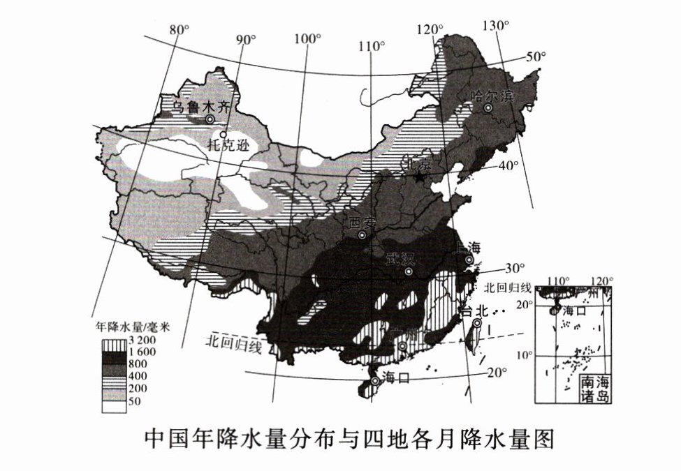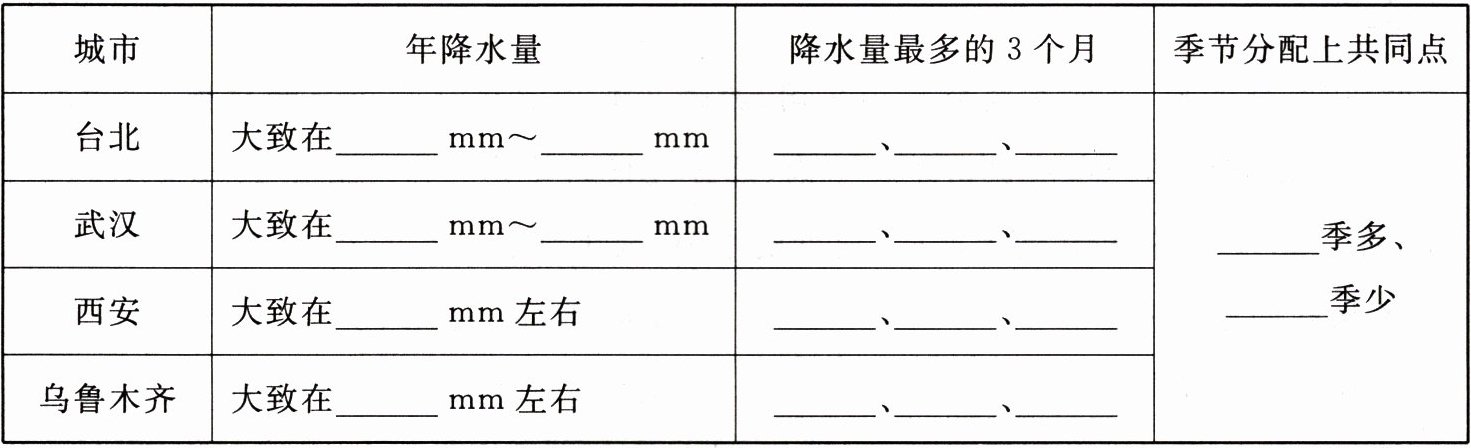 (1) 城市 年降水量 降水量最多的3个月 季节分配上共同点 台北 大致在1600mm~3200mm 6、8、9 武汉 大致在800mm~1600mm 5、6、7 夏秋季多、春冬季少 西安 大致在400mm左右 7、8、9 乌鲁木齐 大致在200mm左右 5、6、7