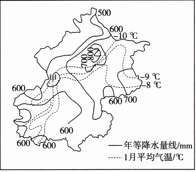 下图为我国东部某地1月平均气温和年等降水量分布图。读图,回答4~6题。