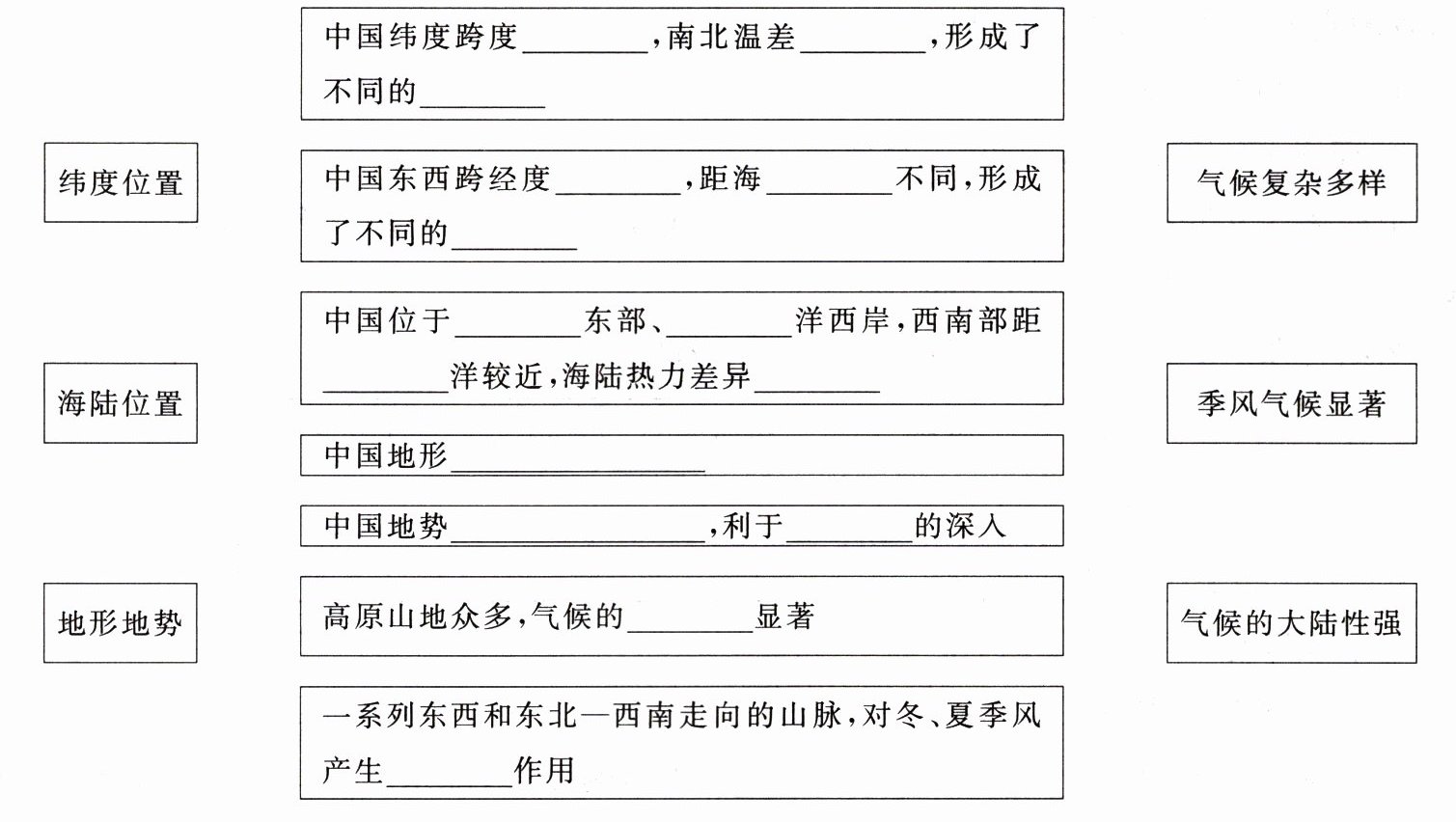 3.纬度位置:中国纬度跨度大,南北温差大,形成了不同的温度带;中国东西跨经度多,距海远近不同,形成了不同的干湿地区。海陆位置:中国位于亚洲东部、太平洋西岸,西南部距印度洋较近,海陆热力差异大。地形地势:中国地形复杂多样;中国地势西高东低,利于海洋湿润气流的深入;高原山地众多,气候的垂直差异显著;一系列东西和东北—西南走向的山脉,对冬、夏季风产生阻挡作用。这些因素导致中国气候复杂多样、季风气候显著、气候的大陆性强。