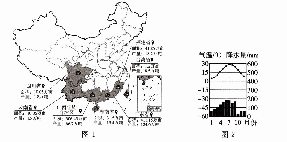 我国是荔枝生产和消费大国。图 1 为我国荔枝主要产区分布图,图 2 为广东省某地气温曲线和降水量柱状图。读图,回答 12~15 题。