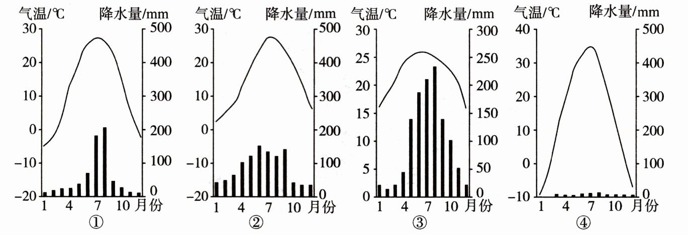 16. 下面为我国四个城市的气候资料图。读图判断,城市名称与序号对应正确的是(