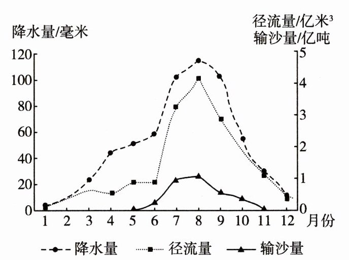 右图为我国某河流中游某水文观测站的多年月平均降水量、径流量、输沙量变化示意图。读图,回答 2~4 题。