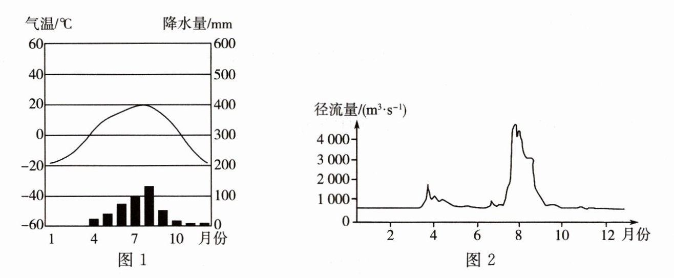 松花江发源于长白山天池,主要流经东北平原的湿润和半湿润地区,是黑龙江在我国境内的最大支流。图 1 为哈尔滨气候资料图,图 2 为松花江哈尔滨水文站径流量年变化曲线图。读图,回答 10~12 题。