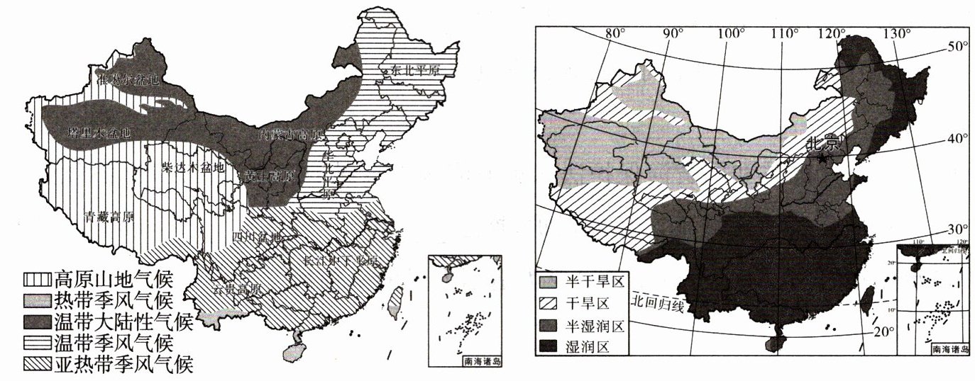 根据我国主要地形区及气候类型分布图和干湿地区分布图,完成下列要求。