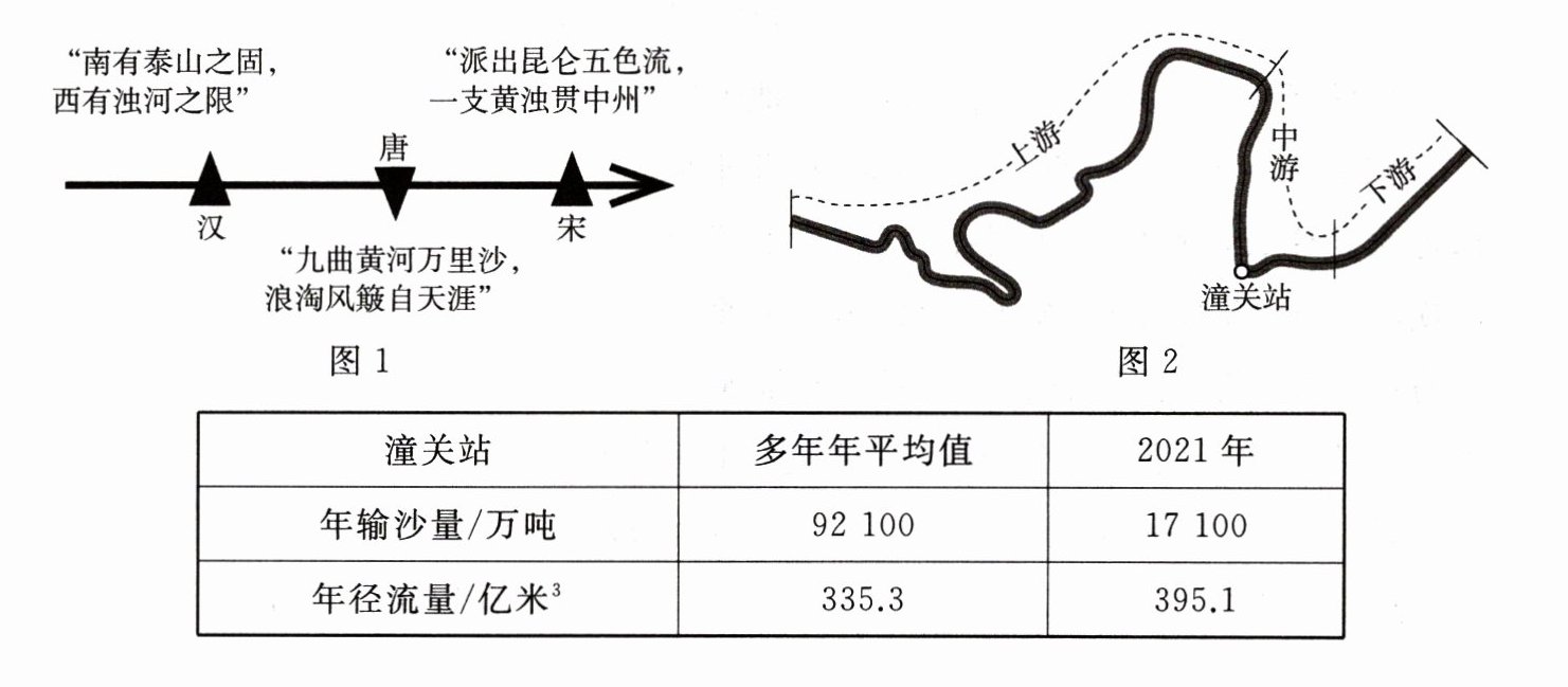 (2023·济南中考)某学校组织了跨学科主题学习,语文、地理老师分别提供了有关黄河的学习资料。图1、图2分别为“黄河诗文”的时间轴及黄河干流示意图,下表为黄河潼关站的水文资料。据此回答8~11题。