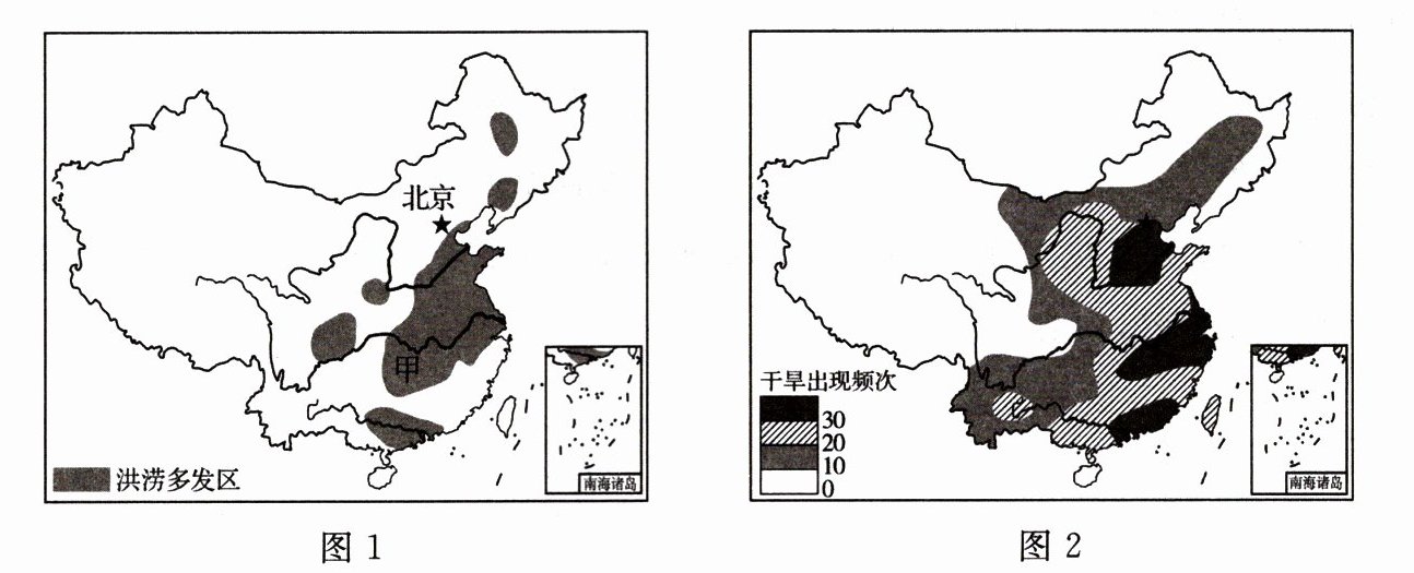 特殊的自然环境和季风气候条件使得我国成为世界上旱涝灾害最为频繁和严重的国家之一。旱涝灾害的频繁发生及持续积累给我国社会发展和生态环境造成严重破坏。图 1 示意我国洪涝灾害分布,图 2 示意我国干旱灾害发生频次分布。读图,回答 10~11 题。