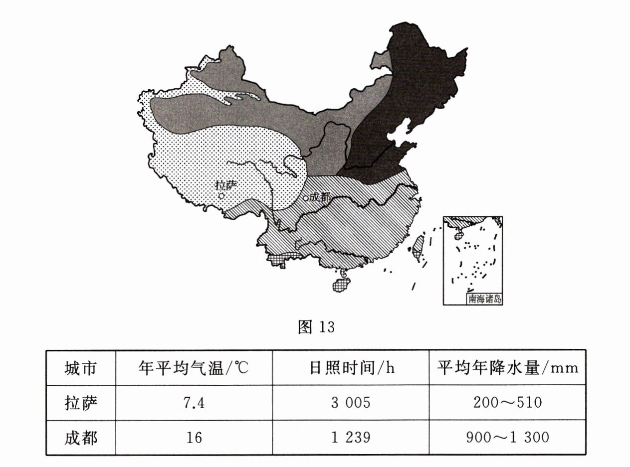 23. 图13为我国气候类型分布示意图,下表为成都、拉萨的气候统计表。据此完成下列要求。