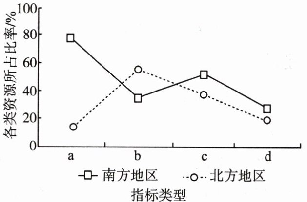 (2024·四川中考)下图为我国南方地区和北方地区土地面积、水资源总量、人口及耕地等指标对比图。读图,回答2~3题。
