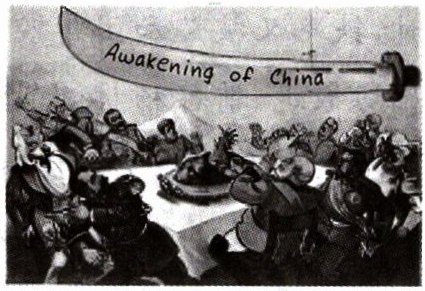 5.(检测目标 1)(经典题)1901 年,美国杂志PUCK发表了一幅漫画《亚洲的潜在忧患》,画中刀上的文字是Awakening of China(中国人的觉醒),只要悬吊大刀的绳一断……从漫画中可以获取的信息是(