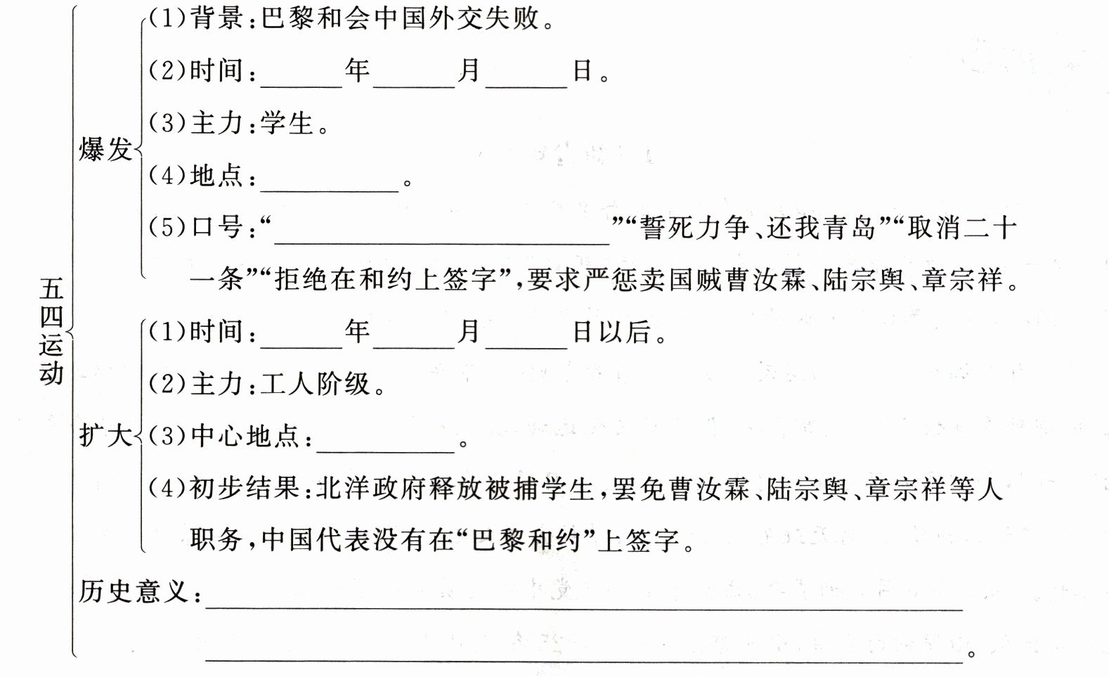 (5)口号:“外争主权,内除国贼”“誓死力争、还我青岛”“取消二十一条”“拒绝在和约上签字”,要求严惩卖国贼曹汝霖、陆宗舆、章宗祥。