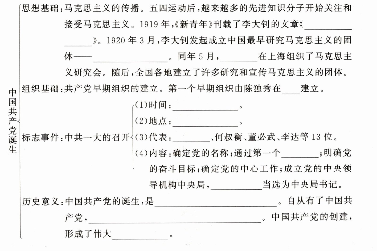 (4)内容:确定党的名称;通过第一个党纲;明确党的奋斗目标;确定党的中心工作;成立党的中央领导机构中央局,陈独秀当选为中央局书记。