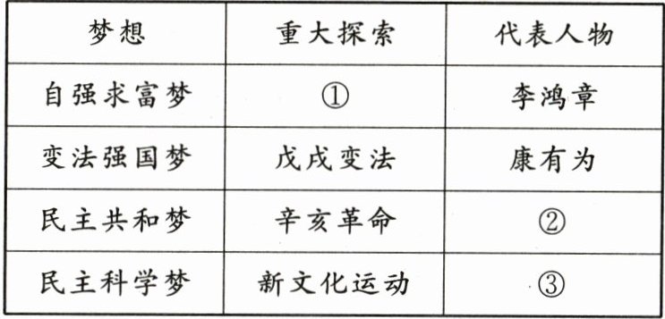 16.下列表格归纳了近代以来先进中国人为实现民族复兴进行的四次重大探索。表中①、②、③的最佳答案是(