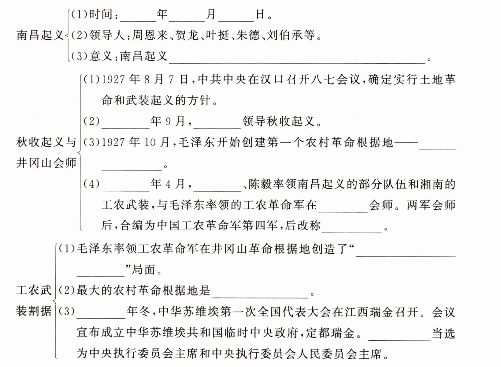 (4)1928;朱德;井冈山;中国工农红军第四军。工农武装割据