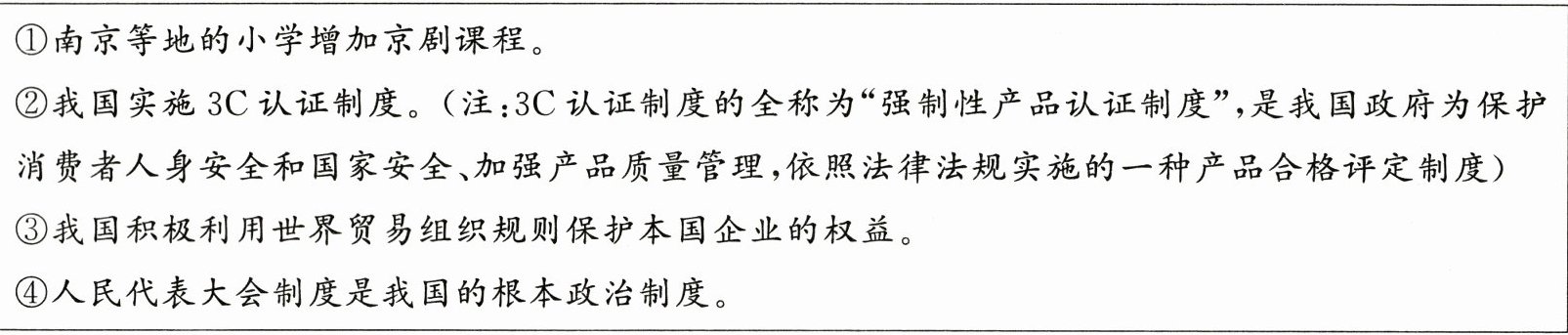 (1)①南京等地小学增加京剧课程涉及文化利益。 ②我国实施3C认证制度涉及经济利益和安全利益。 ③我国积极利用世界贸易组织规则保护本国企业权益涉及经济利益。 ④人民代表大会制度是根本政治制度涉及政治利益。(4分)